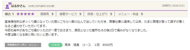 産後慢性的なぎっくり腰になっていた際にこちらへ駆け込んで治していただき、無事仕事に復帰して以来、たまに無理が祟って調子が悪くなると通わせていただいてます。